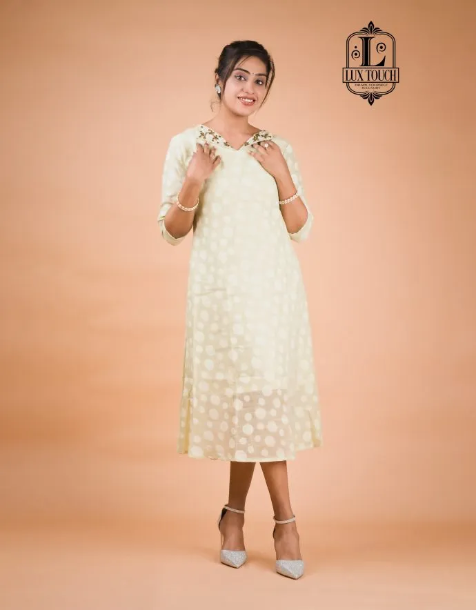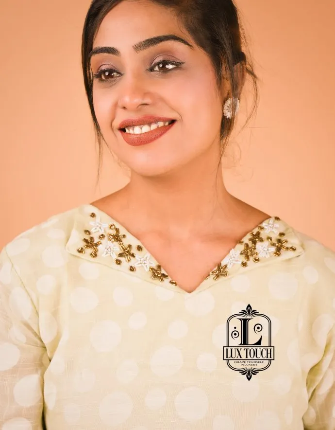 This kurti features a beautiful light yellow color with intricate  handwork along the V-neckline . The fabric is lightweight, making it comfortable to wear for various occasions. It’s perfect for a chic and elegant look.