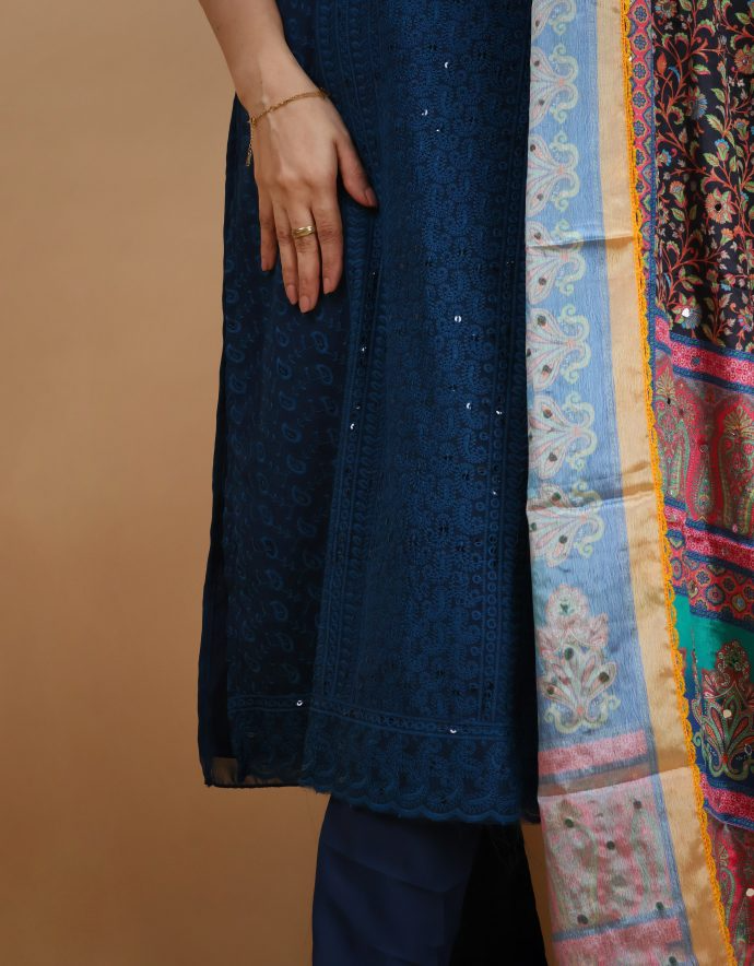 A Chikankari suit with a Pakistani dupatta combines the delicate artistry of Chikankari embroidery with the luxurious appeal of a Pakistani dupatta. This Chikankari suit, typically made of  georgette, features intricate geometric patterns. The Pakistani dupatta, often crafted from chiffon adds elegance with its rich mirror work.  This fusion creates a stunning ensemble, perfect for formal occasions, offering a blend of traditional refinement and vibrant embellishments, with the dupatta adding a bold contrast or complement to the suit.