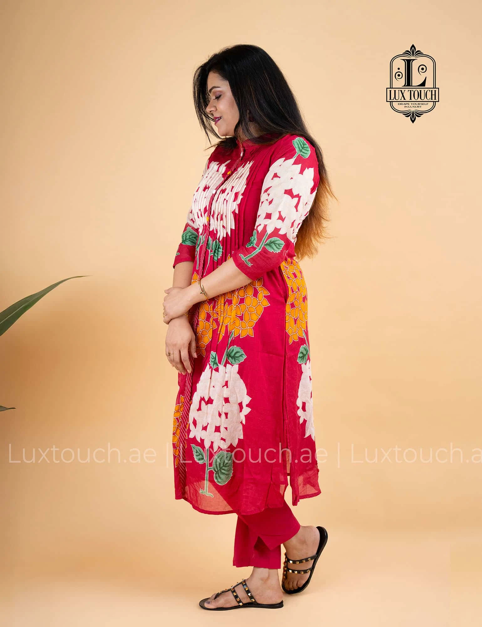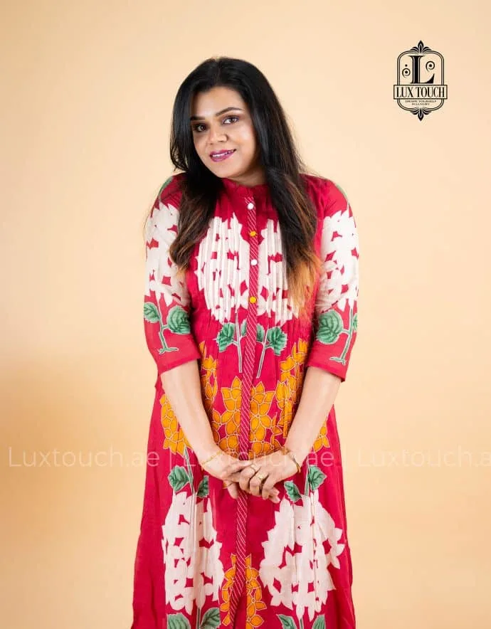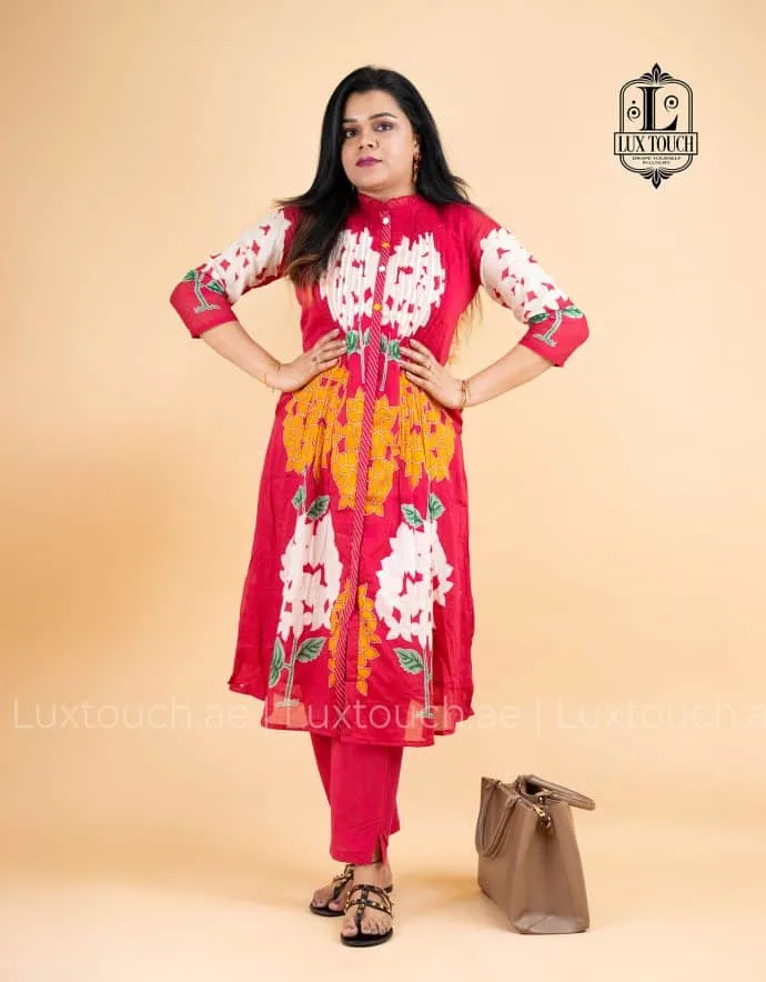 This elegant outfit features a pastel green straight-cut kurti adorned with vibrant floral prints in shades of red and white, complemented by leafy green stems that create a striking contrast. The kurti is designed with a mandarin collar and front button placket, accentuated by pink buttons that add a pop of color. The upper front yoke is detailed with fine pin-tuck pleats, giving it a refined texture. The three-quarter sleeves showcase a subtle leafy print, echoing the kurti’s botanical theme. Made from a breathable cotton or cotton-blend fabric, it ensures comfort while maintaining a stylish silhouette. Paired with matching straight-cut pants in the same pastel green hue, the bottoms offer a tapered fit with a small slit at the ankle, enhancing both comfort and style. This ensemble perfectly blends modern structure with traditional charm, making it ideal for semi-formal and casual occasions.