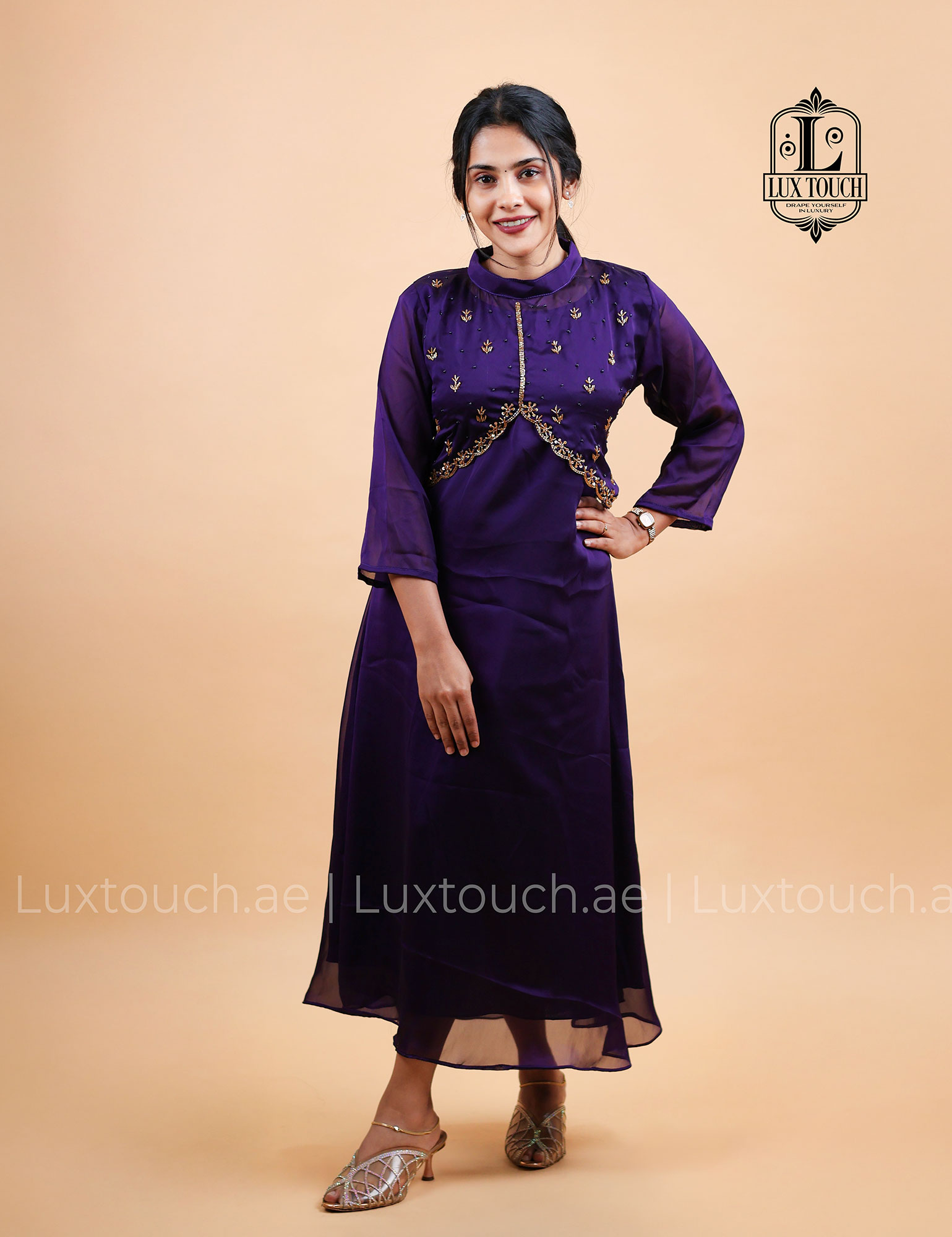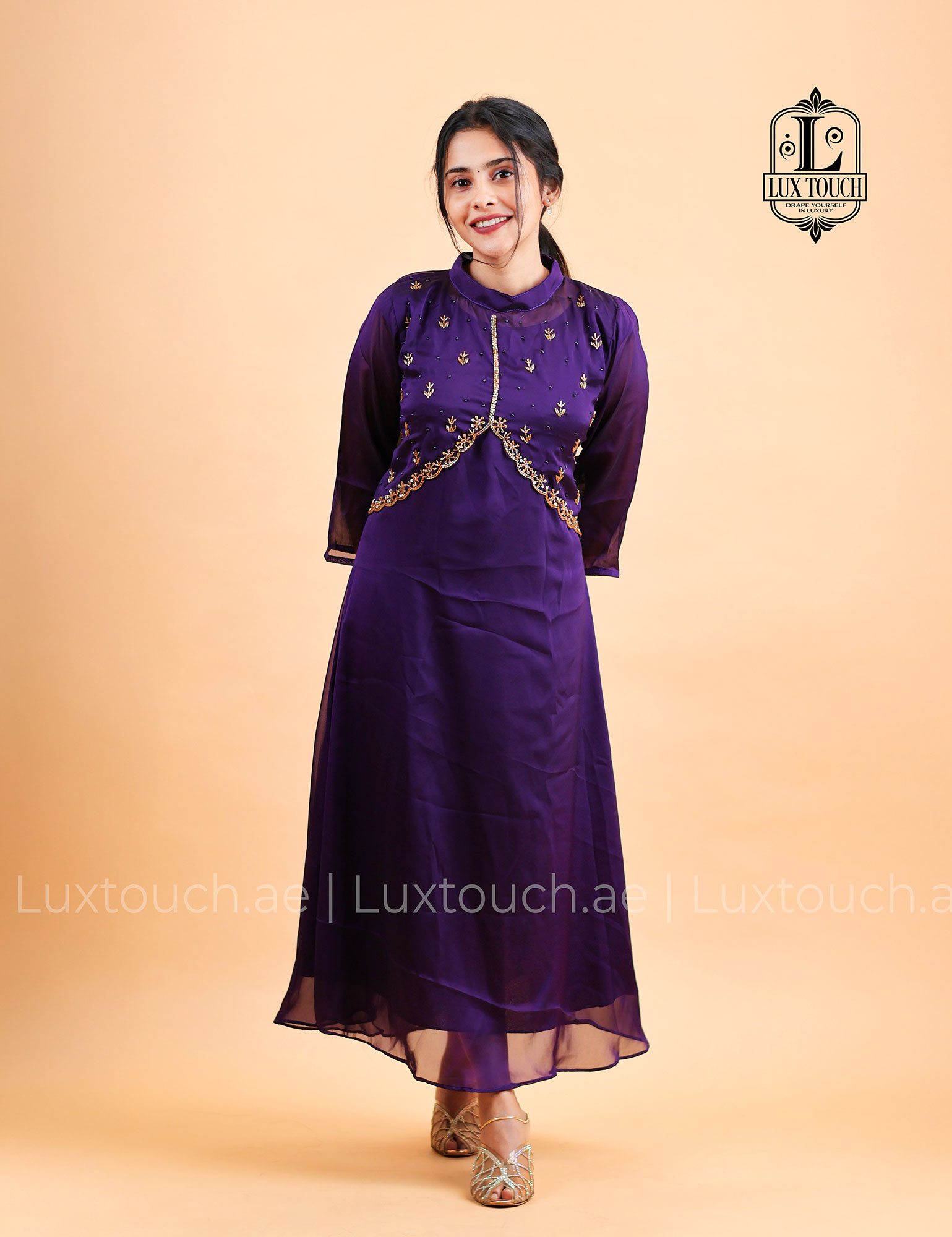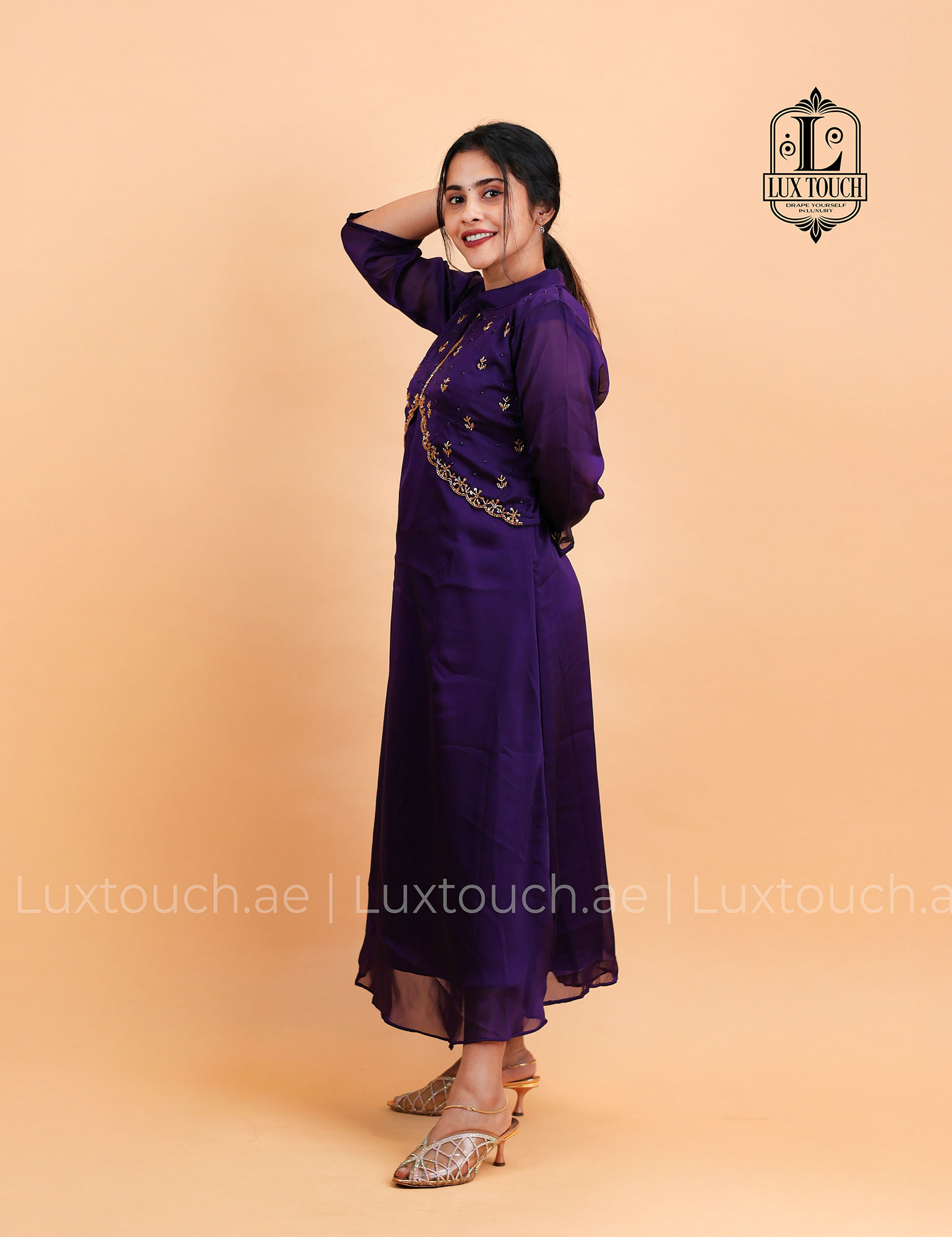 The vibe of this dress is quietly elegant with a refined, contemporary ethnic charm. The deep purple hue immediately conveys richness and sophistication, while the delicate gold embroidery adds a touch of understated luxury rather than overt opulence. The silhouette is graceful and fluid, striking a balance between tradition and modern minimalism, which gives it a poised, confident feel. The sheer sleeves and soft fall of the fabric create an airy, feminine softness, while the structured detailing around the bodice adds definition and polish. Overall, the dress exudes a calm, graceful confidence—perfect for someone who prefers timeless elegance with subtle detailing over bold extravagance, making it suitable for festive gatherings, formal evenings, or cultural events with a modern sensibility.