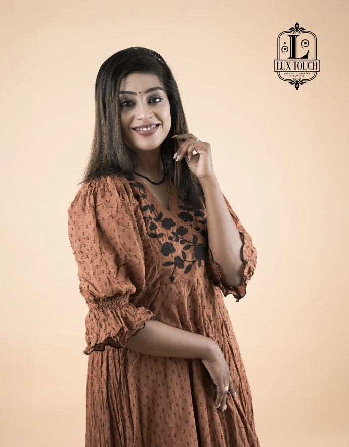 This stylish rust-orange midi dress features a relaxed, flared silhouette with a flowy hemline finished with delicate lace trim. The fabric has a subtle dotted texture, adding depth to the design. A standout element is the black floral embroidery on the chest, creating a striking contrast and artistic flair. The dress has a V-neckline and three-quarter puffed sleeves with gathered elastic cuffs, offering both comfort and elegance. Lightweight and airy, this dress is perfect for casual outings, festive gatherings, or relaxed daywear with a bohemian twist.