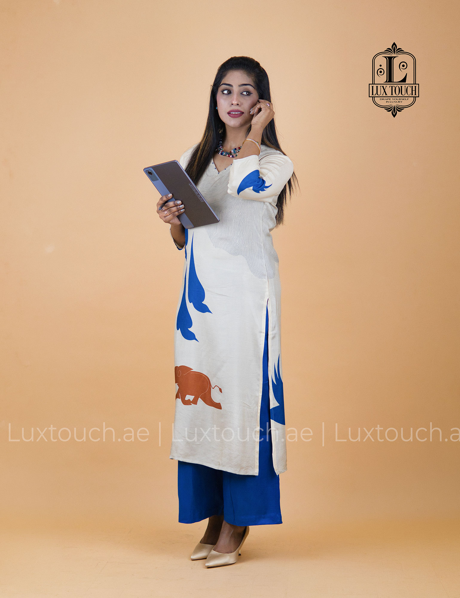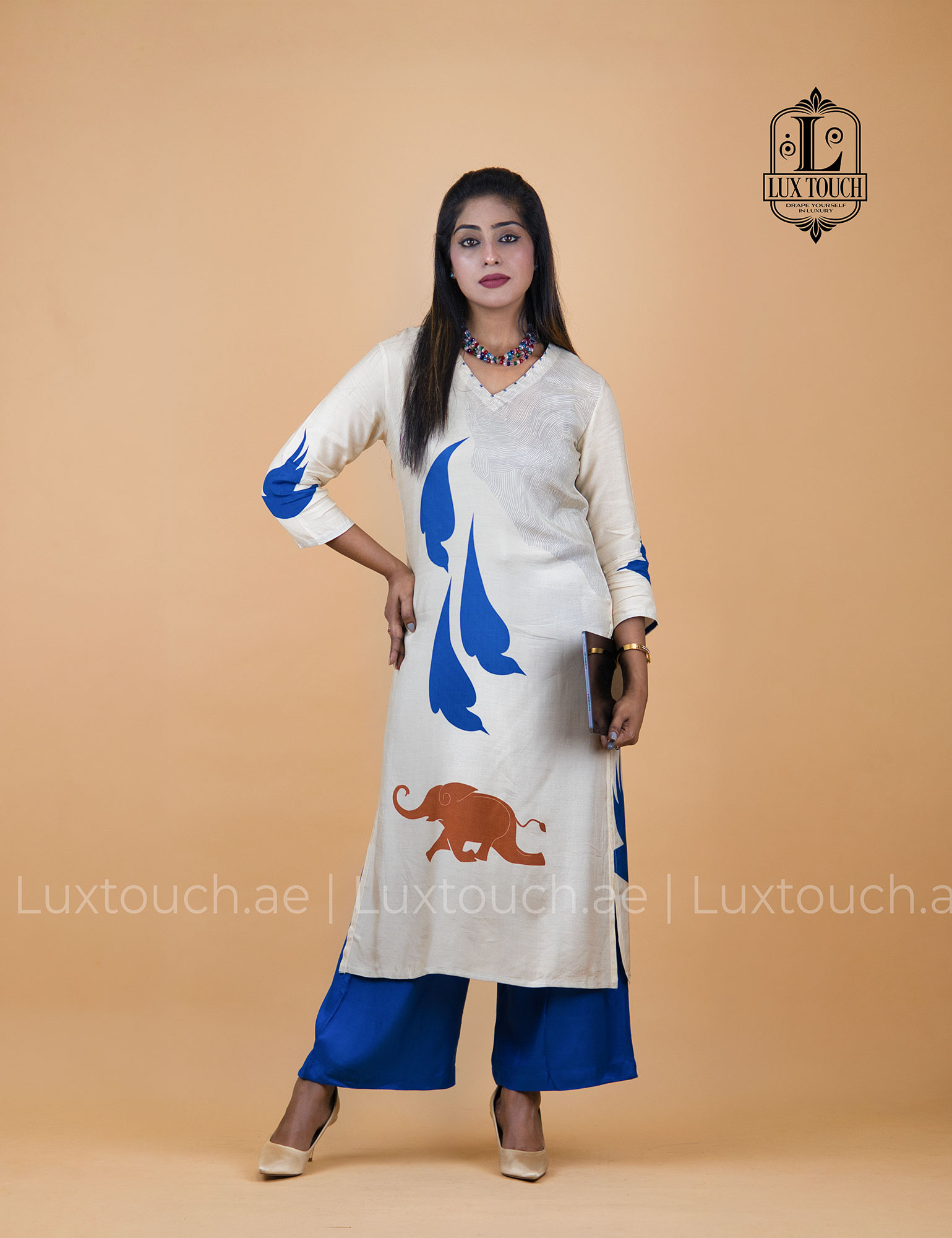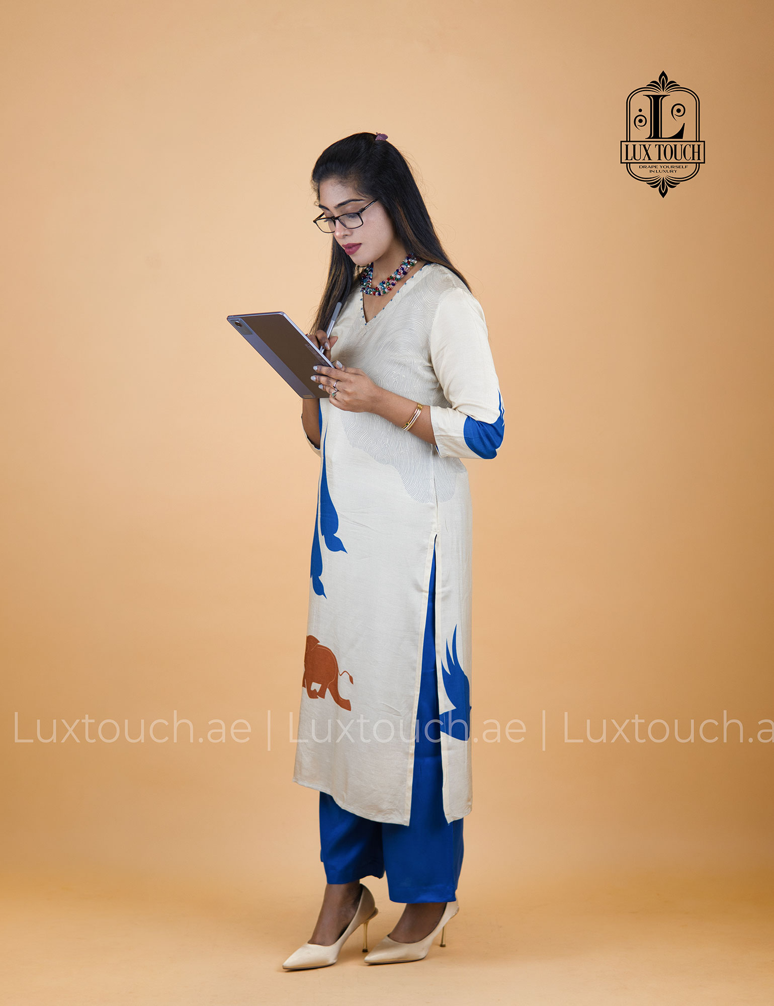 The dress gives off a modern ethnic vibe with a calm, artistic edge. Its soft cream base creates a clean and elegant foundation, while the bold blue abstract prints add a contemporary, expressive touch. The subtle yet striking orange elephant motif introduces a hint of cultural charm and individuality, making the outfit feel rooted yet creative. Overall, it feels effortlessly stylish—perfect for someone who wants to look graceful but also stand out in a minimal, sophisticated way, whether for casual gatherings, workwear, or relaxed festive occasions.