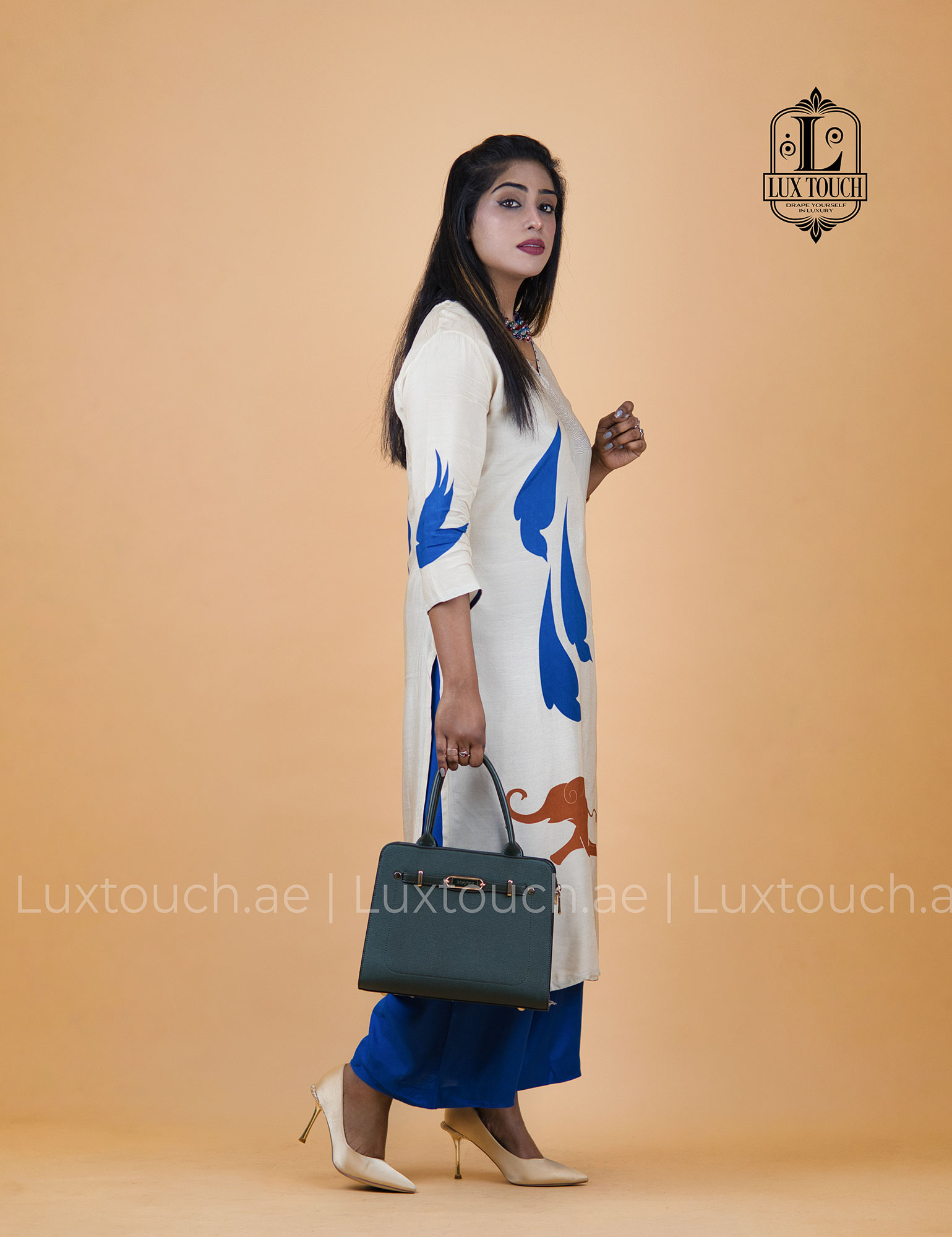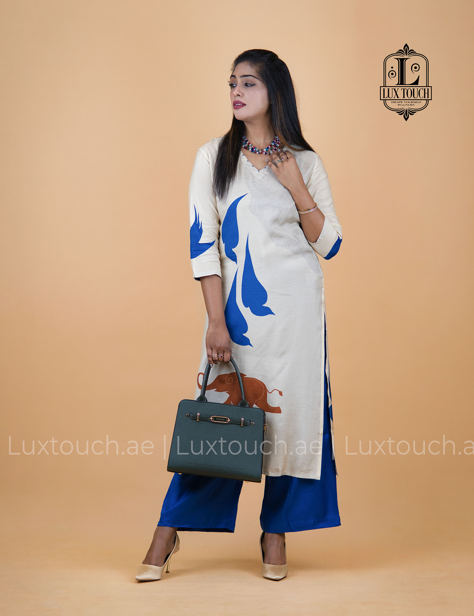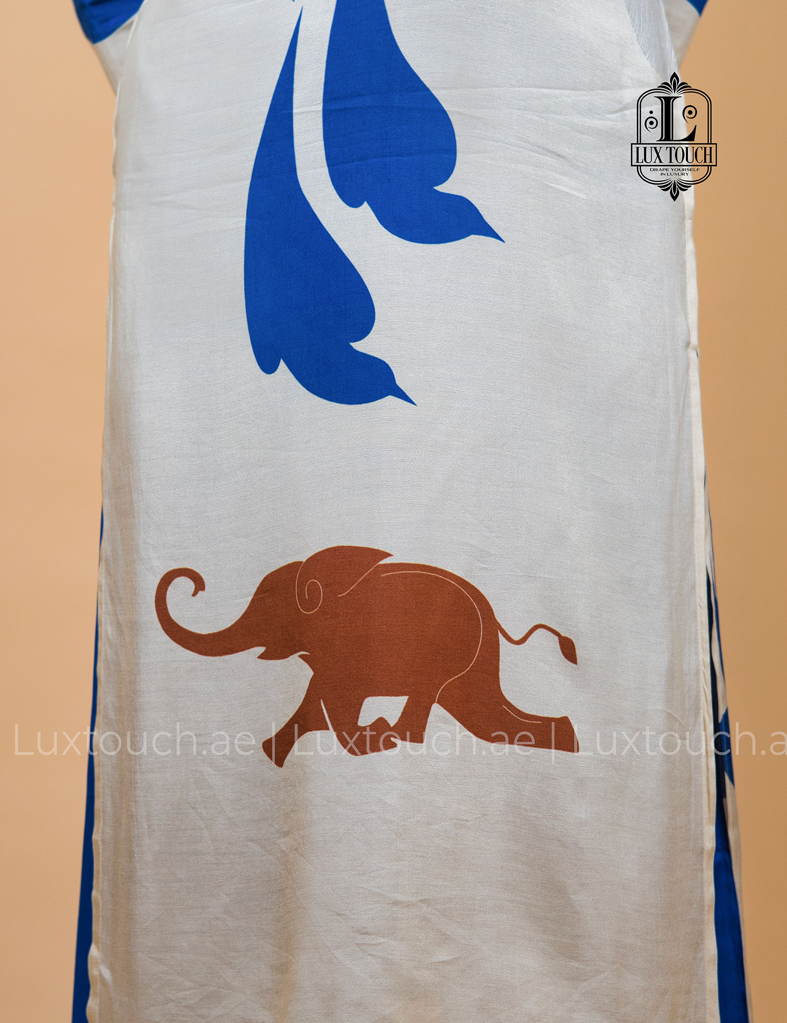 The dress gives off a modern ethnic vibe with a calm, artistic edge. Its soft cream base creates a clean and elegant foundation, while the bold blue abstract prints add a contemporary, expressive touch. The subtle yet striking orange elephant motif introduces a hint of cultural charm and individuality, making the outfit feel rooted yet creative. Overall, it feels effortlessly stylish—perfect for someone who wants to look graceful but also stand out in a minimal, sophisticated way, whether for casual gatherings, workwear, or relaxed festive occasions.