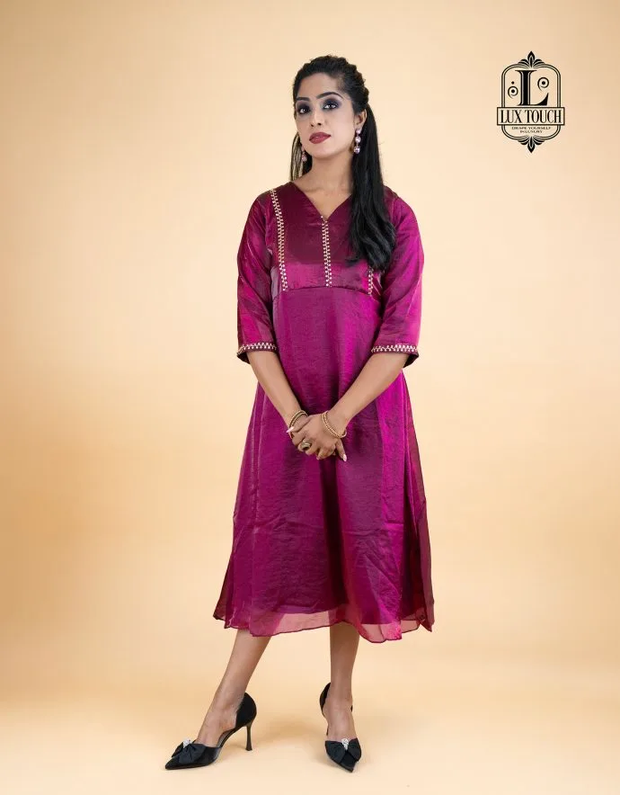 Elegant and effortlessly chic, this deep magenta silk dress blends traditional charm with modern style. The lustrous fabric, V-neckline, and golden lace detailing add a touch of sophistication, while the flared midi silhouette ensures graceful movement. Perfect for festive occasions or evening gatherings — timeless, feminine, and refined.