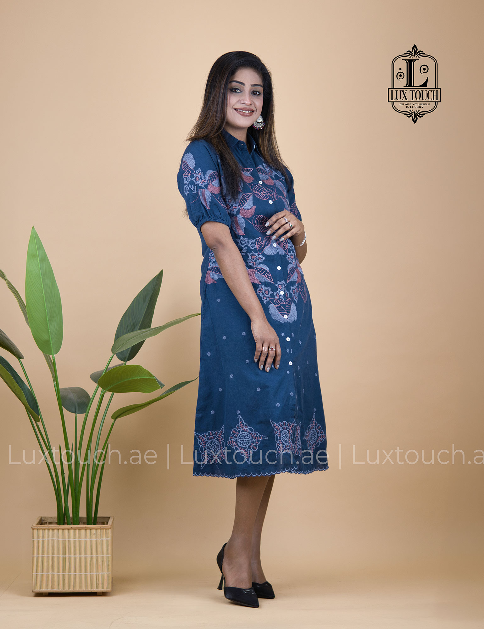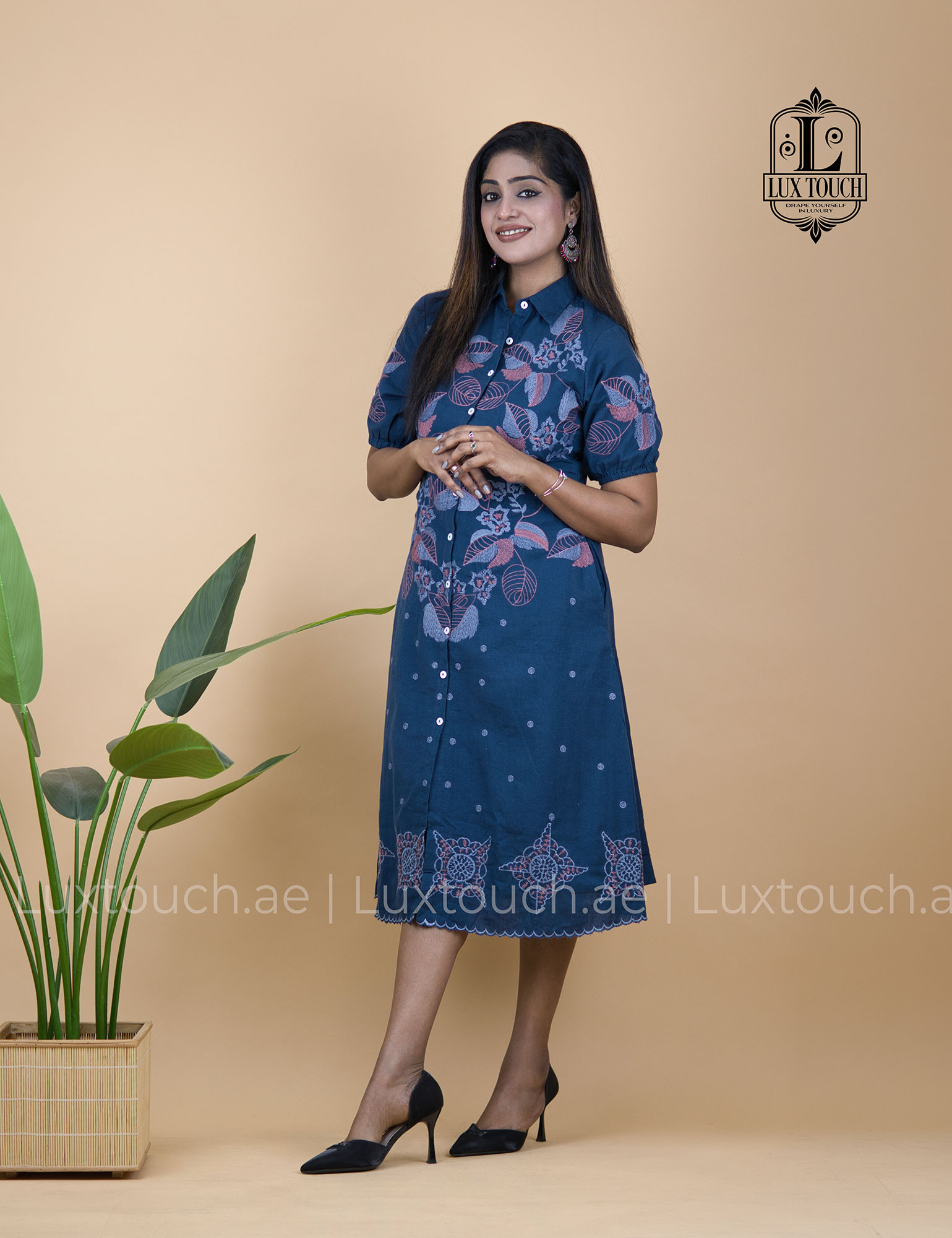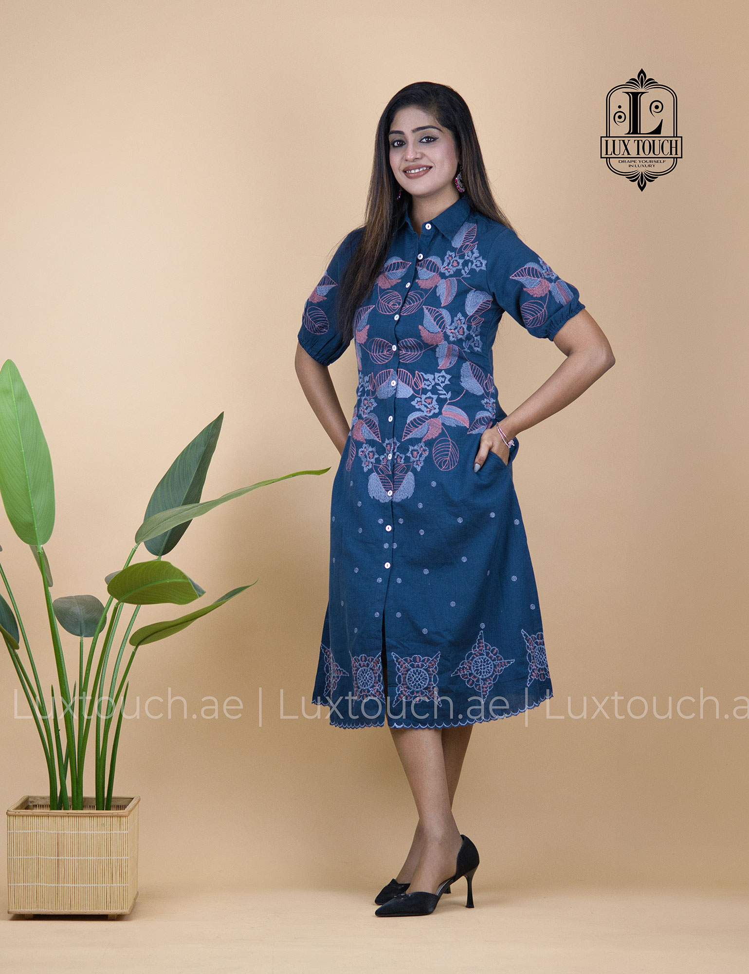 The dress has an effortlessly elegant and smart-casual vibe, blending a structured shirt-dress silhouette with soft, feminine details. Its deep navy blue base gives it a refined and versatile look, while the delicate floral embroidery in muted tones across the upper bodice adds a touch of traditional charm. The design is thoughtfully balanced with subtle dotted patterns on the lower half and an intricate embroidered border near the hem, creating visual interest without overwhelming the outfit. The collared neckline and button-down front lend a polished, tailored feel, while the slightly puffed short sleeves soften the overall look. Falling just below the knee with a relaxed yet flattering fit, the dress strikes a perfect balance between comfort and sophistication, making it suitable for both casual outings and semi-formal settings.
