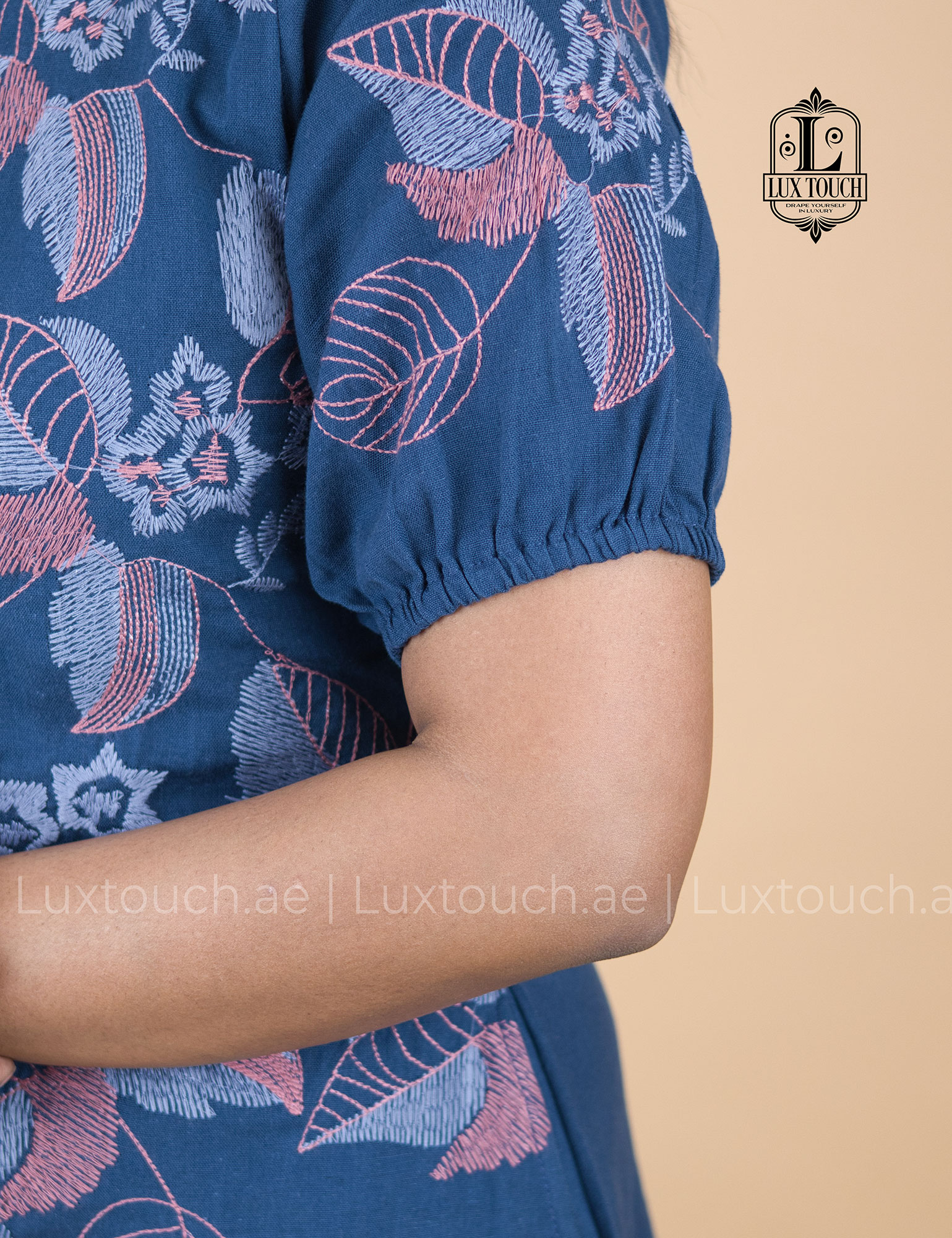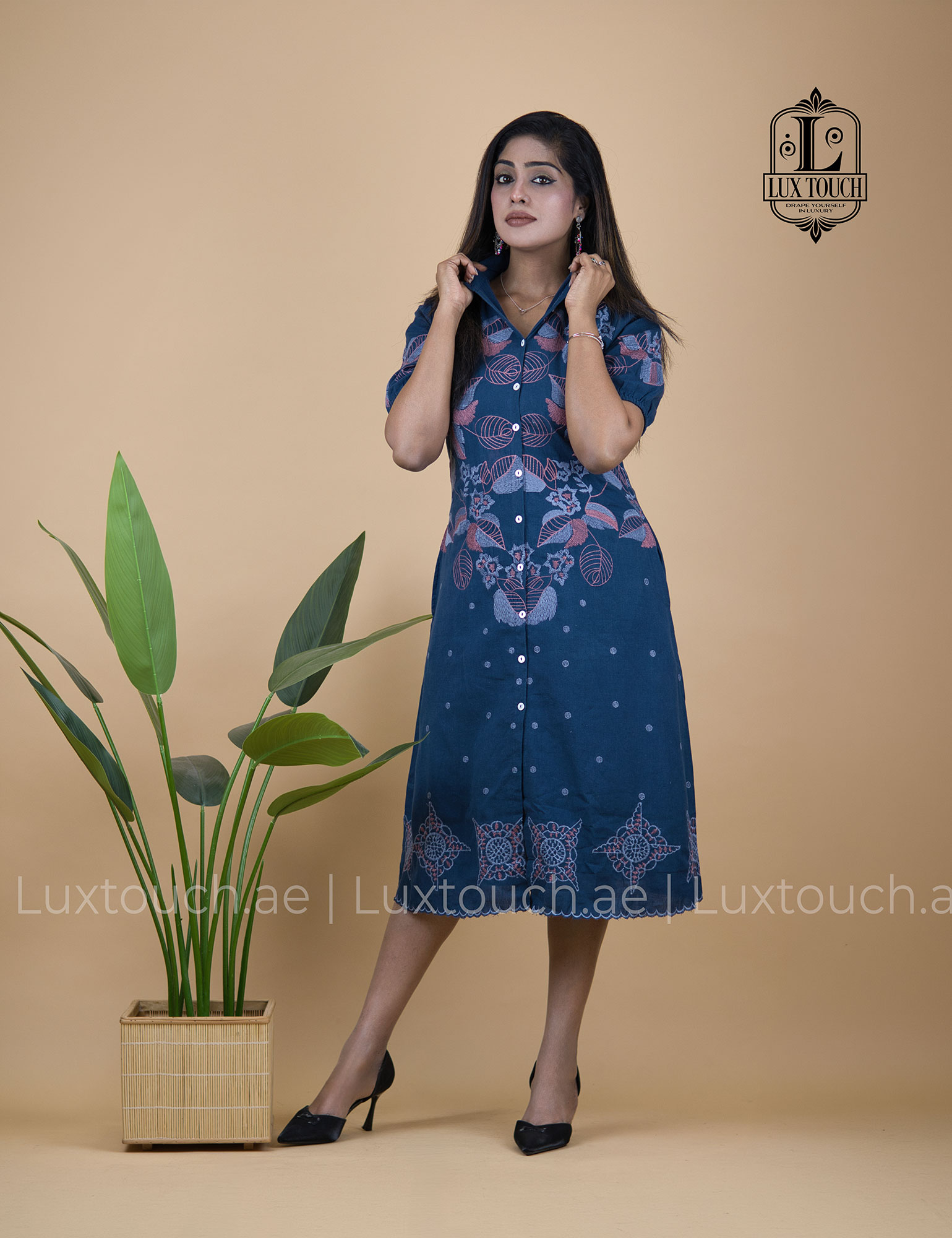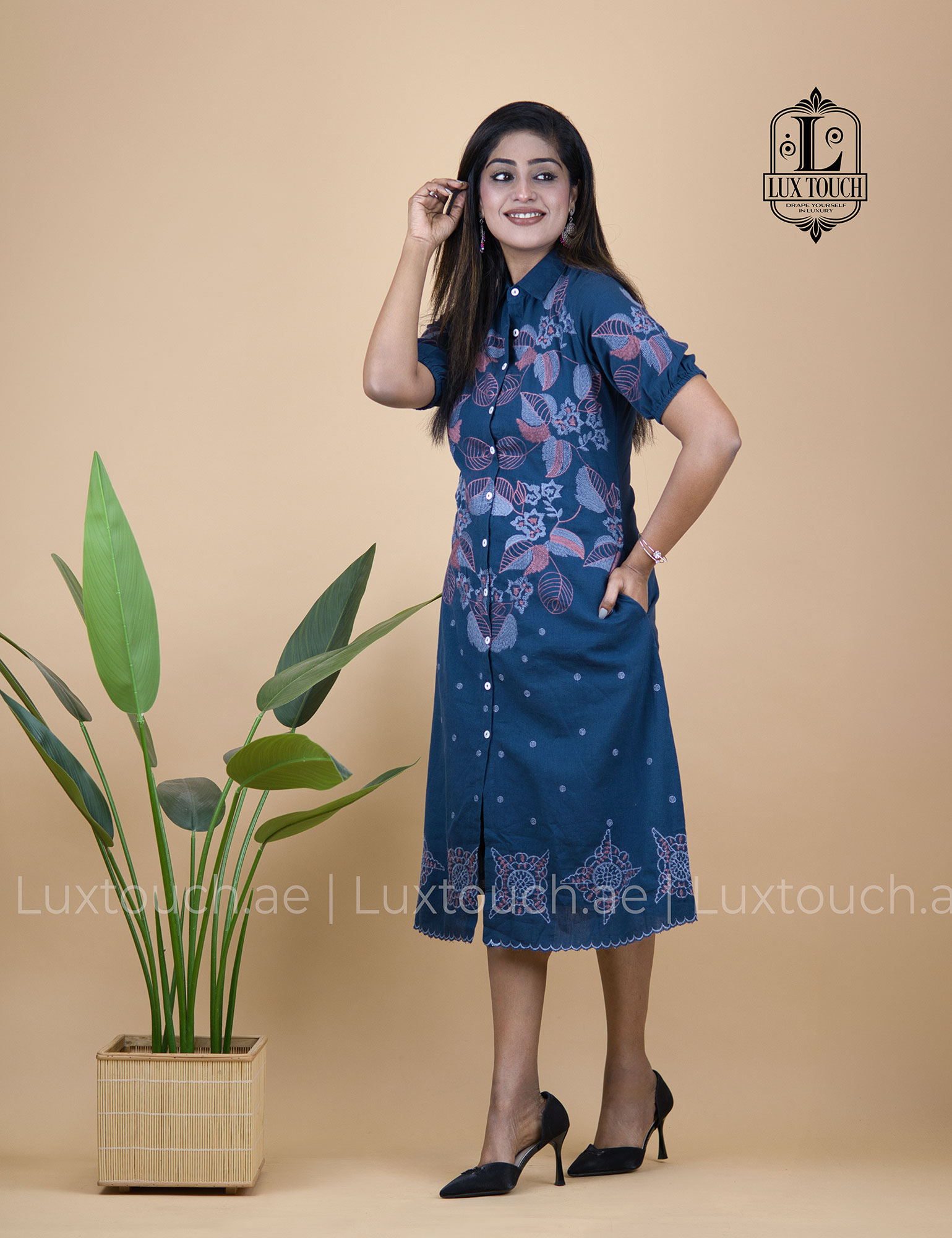 The dress has an effortlessly elegant and smart-casual vibe, blending a structured shirt-dress silhouette with soft, feminine details. Its deep navy blue base gives it a refined and versatile look, while the delicate floral embroidery in muted tones across the upper bodice adds a touch of traditional charm. The design is thoughtfully balanced with subtle dotted patterns on the lower half and an intricate embroidered border near the hem, creating visual interest without overwhelming the outfit. The collared neckline and button-down front lend a polished, tailored feel, while the slightly puffed short sleeves soften the overall look. Falling just below the knee with a relaxed yet flattering fit, the dress strikes a perfect balance between comfort and sophistication, making it suitable for both casual outings and semi-formal settings.