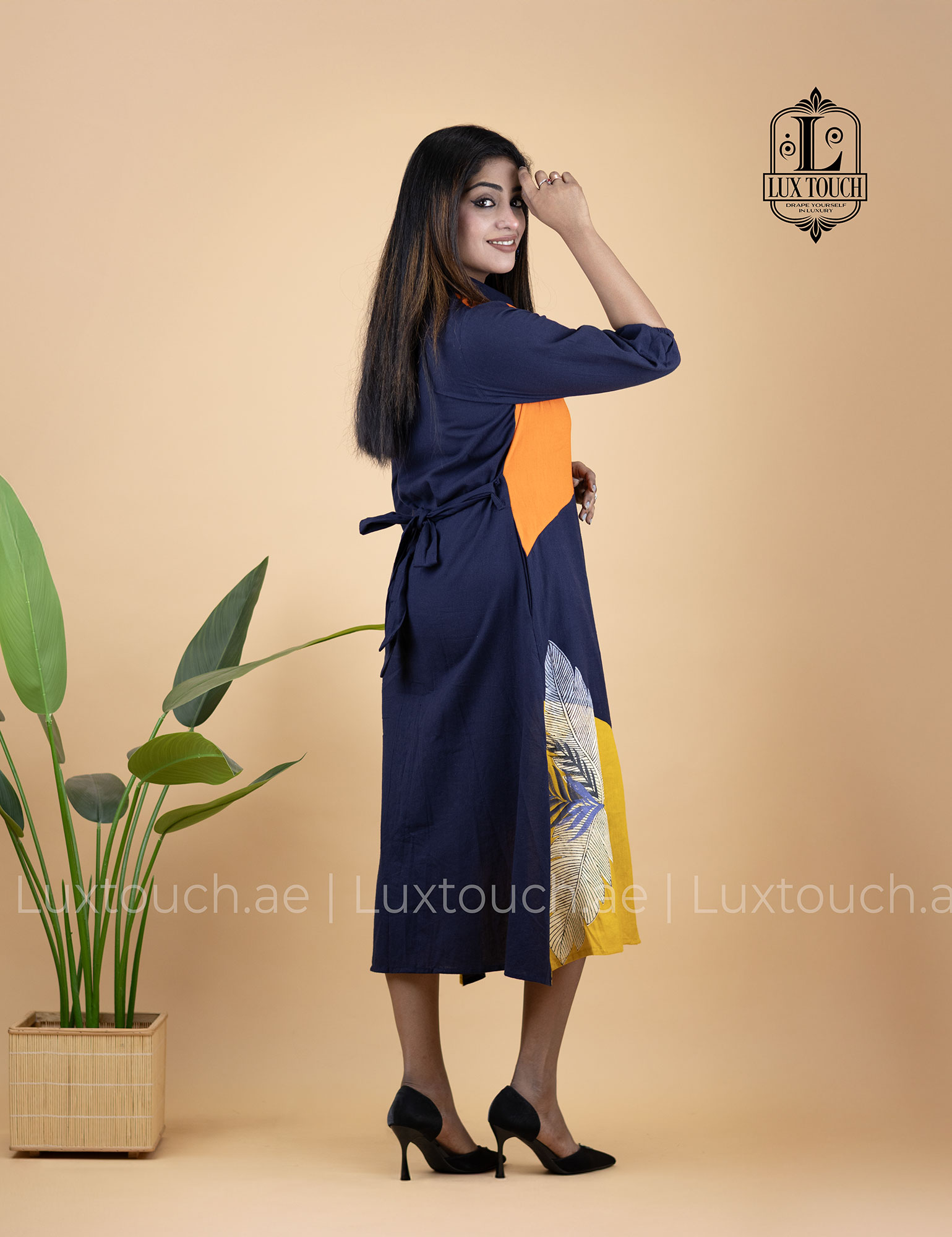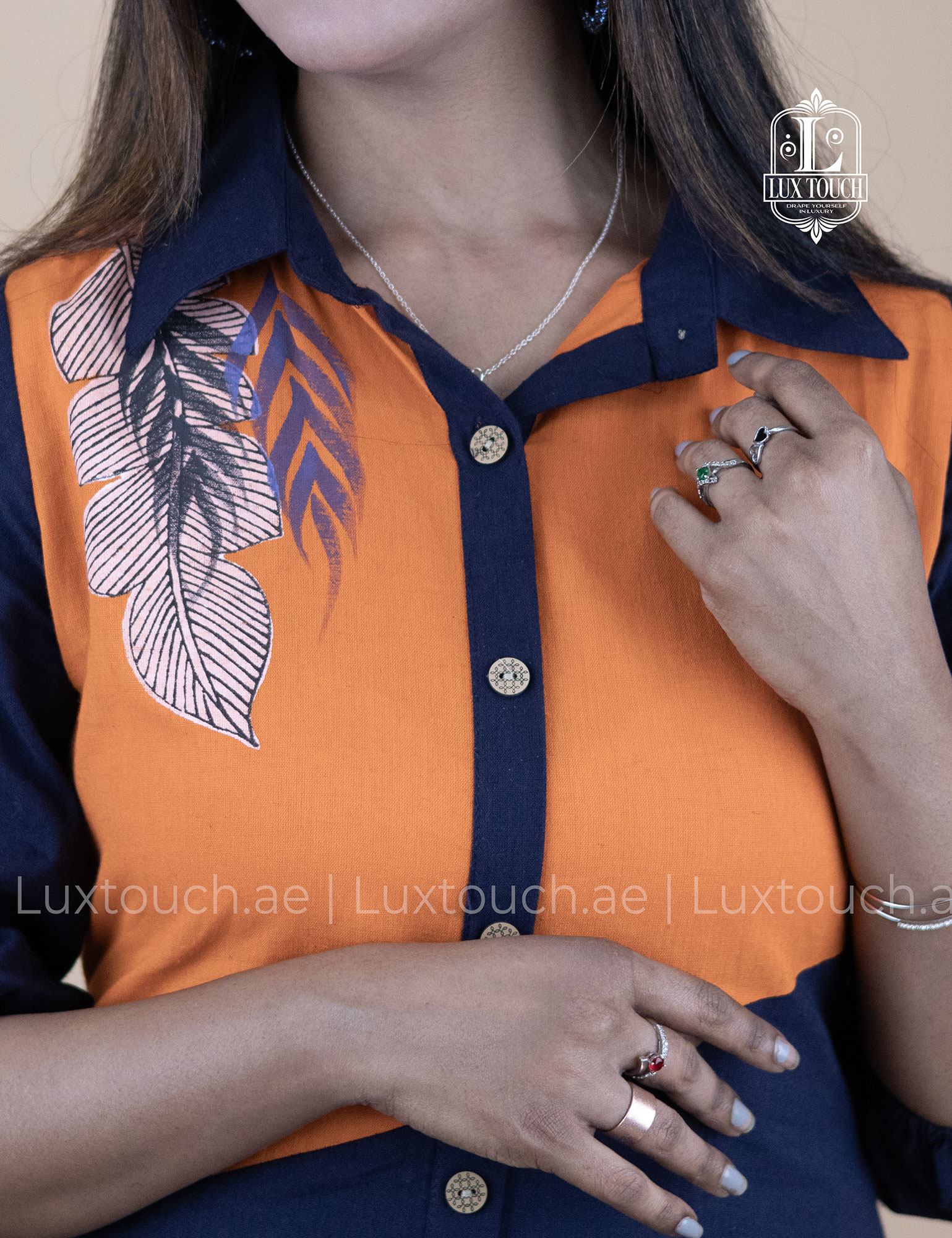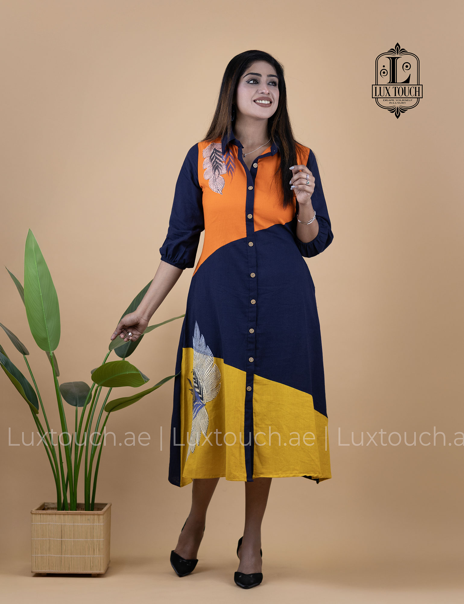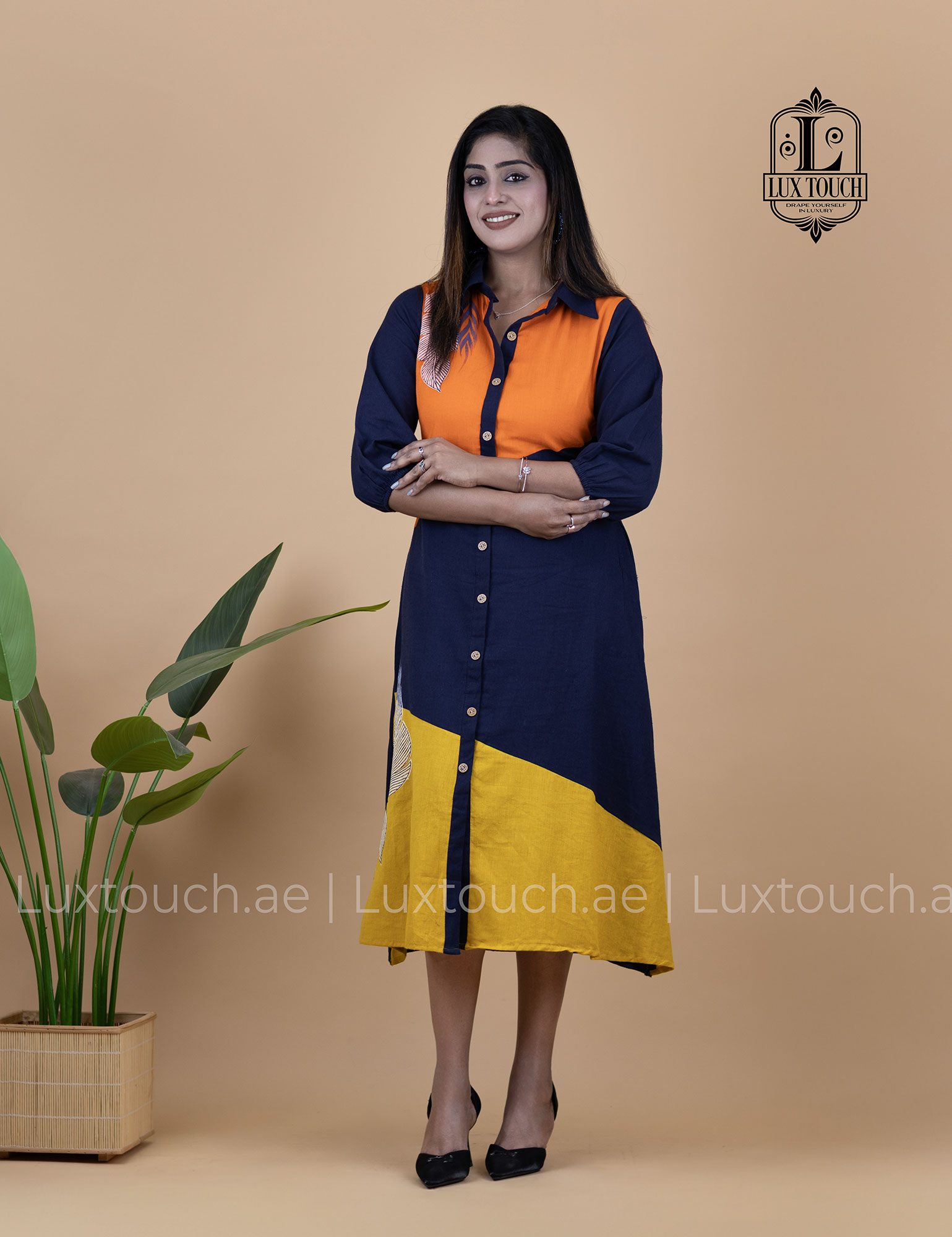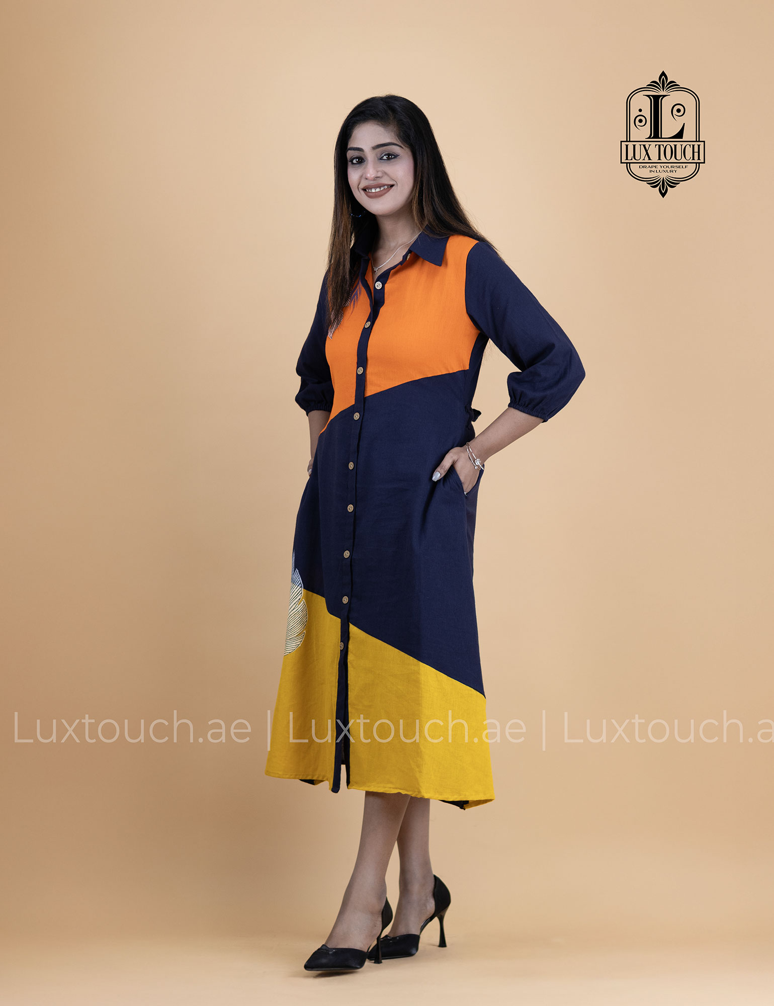 The dress carries a confident yet effortless vibe, blending modern sophistication with an easygoing, everyday elegance. Its bold color blocking adds a striking visual appeal without feeling overpowering, while the structured shirt collar and button-down silhouette keep the look polished and versatile. The relaxed fit and midi length bring comfort and grace, making it ideal for long workdays that transition smoothly into casual evenings. Overall, the dress feels contemporary, poised, and expressive—perfect for someone who enjoys standing out subtly while staying comfortable and refined.