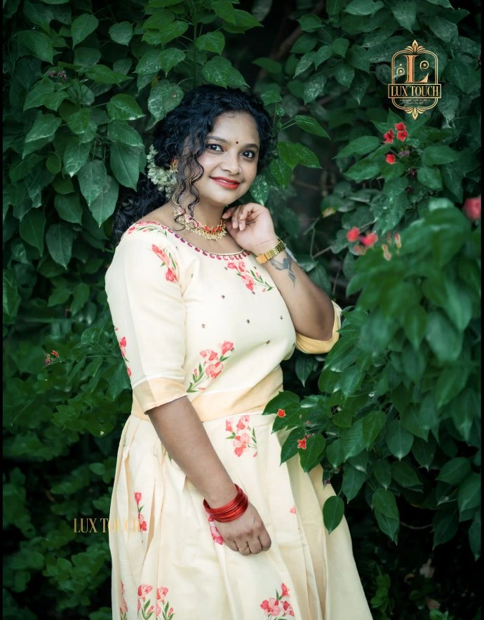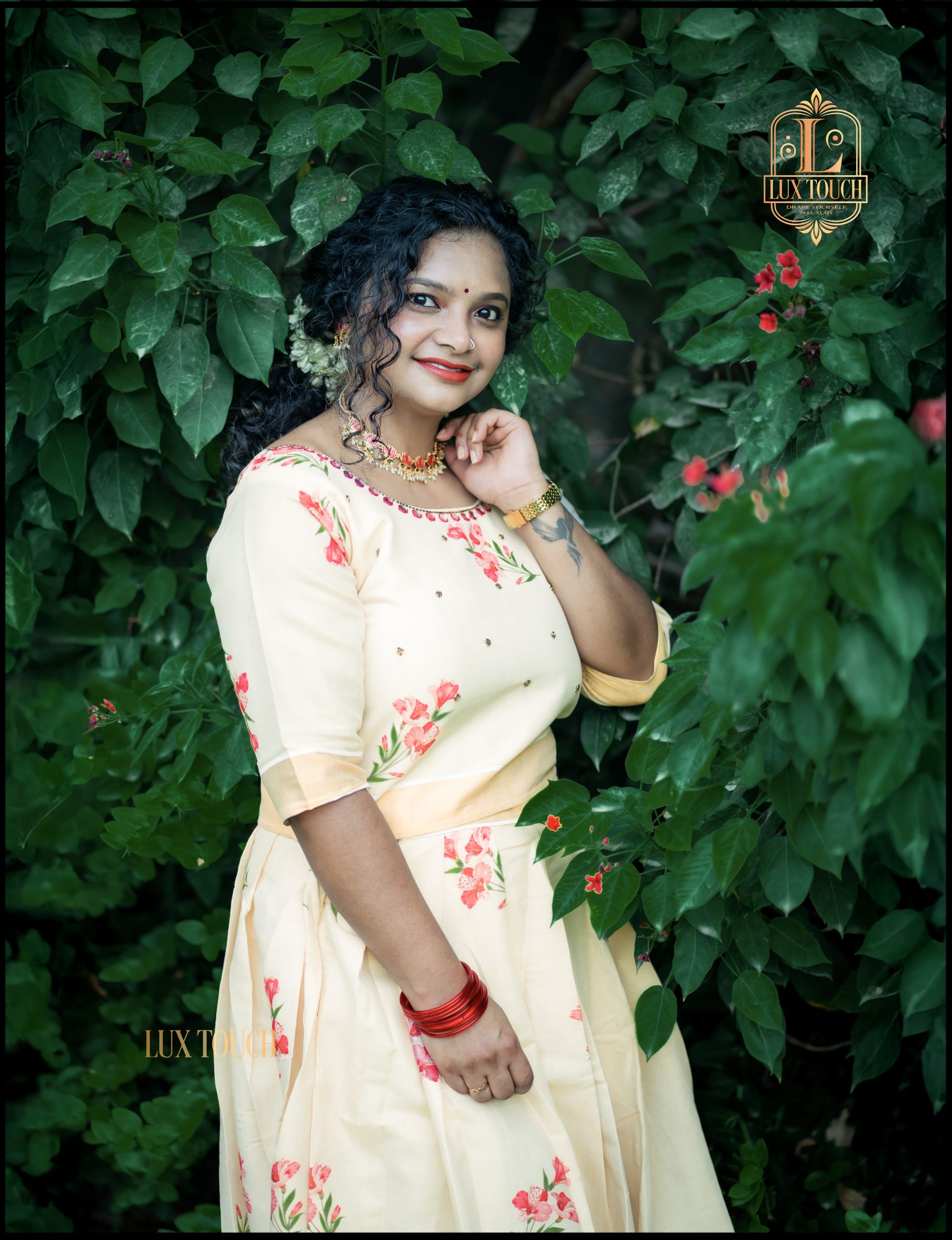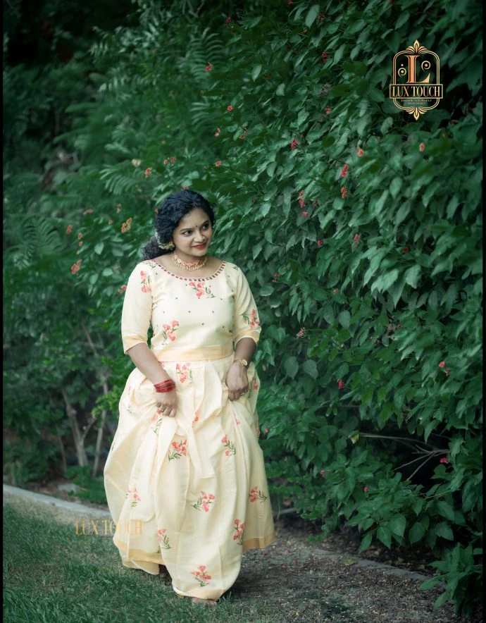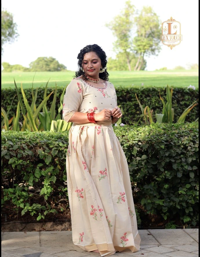 The dress features a flowing, floor-length silhouette crafted from a soft, lightweight fabric that catches the light beautifully. Its warm neutral tone complements the elegant setting, while subtle embellishments add texture without overpowering the design. With a modest neckline and gently defined waist, it exudes timeless sophistication—perfect for evening wear or boutique branding visuals.